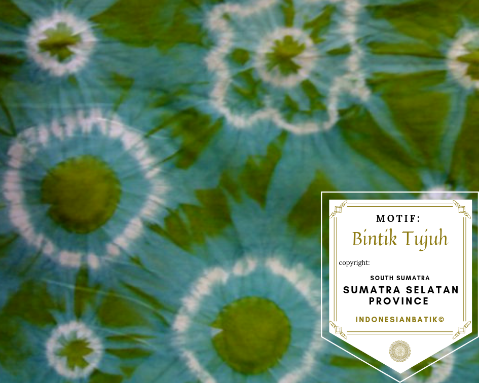 Batik Palembang also has a specialty in producing Batik cloth with a tie-dye technique. The Bintik Tujuh (Seven Dots) motif has 7 white spots and green color gradation as the result of the tie-resist-dyeing process. It also signifies the 7 layers of the sky. Number 7 is considered as a sacred number in Islam.