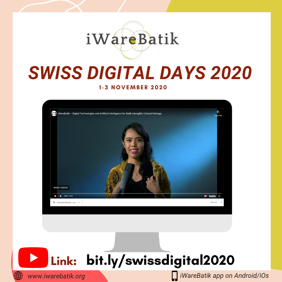 iWareBatik project is selected to take part in Swiss Digital Days 2020, a Swiss national program to foster digital technologies for mankind. The Swiss Digital Days event is a prestigious Swiss national event whose aim to make digitisation a tangible experience and promote new thinking and innovations. All the team members involved in iWareBatik project are very honoured and grateful to receive the support and the acceptance from the Swiss public. Representing Indonesia @indonesiainbern, USI Universita della Svizzera Italiana Swiss @usiuniversity, Lugano city @luganolivinglab@ideatorio_usi, and Ticino region, iWareBatik presents an answer on how digital technology and artificial intelligence can facilitate the preservation of thousand-years old Batik visual arts. The news article can be accessed here