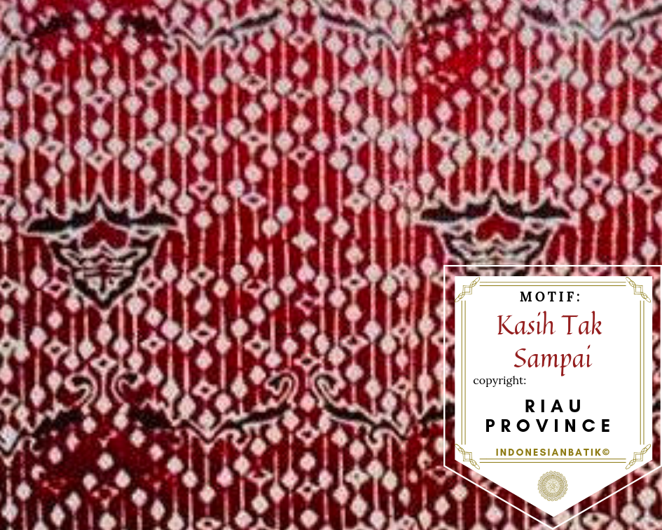 ‘‘Kasih Tak Sampai’ is an idiom in the Indonesian language which refers to two different meanings of “forbearing love” and “unrequited love”. In the context of Riau Batik, this motif means a forbearing love of parents towards the child. Riau parents are expected not to spoil and show excessive love for their children in order to build children’s strong mentality and resilience.