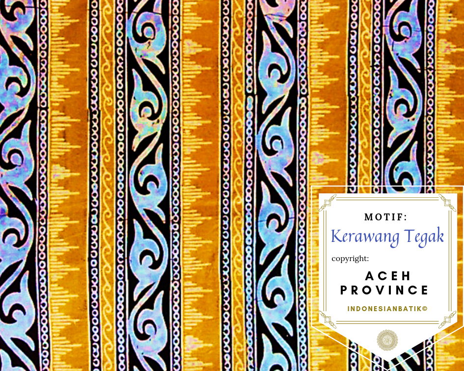 Motif Kerawang Tegak melambangkan seseorang yang memiliki kesadaran yang kuat akan Tuhan. Warna putih melambangkan kesucian, kuning melambangkan kemuliaan, dan hitam melambangkan kekuatan dan ketulusan. Warna-warna ini ditemukan di rumah adat Gayo Aceh. Pengguna batik diharapkan menunjukkan pesona pribadi yang religius, luhur, dan memiliki kemurnian hati dan pikiran.