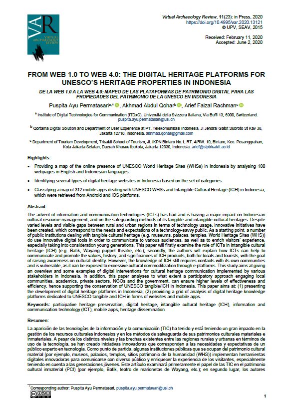 “From WEB 1.0 to WEB 4.0: The Digital Heritage Platforms for UNESCO’s Heritage Properties in Indonesia” – Permatasari, et al., 2020, Virtual Archaeology Review Journal.